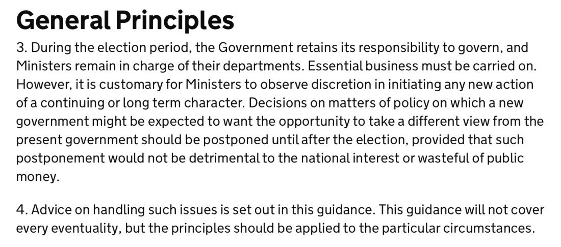 The first and most important thing to understand about this is that the purdah rules – usually a document called “General Election Guidance” issued by the Cabinet Office – are entirely a Government convention. They have no basis in law. They are just an administrative device issued by the Government.
