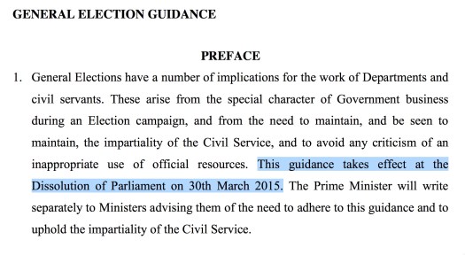 In the good old days, before the Fixed Term Parliament Act (FTPA) of 2011, the ‘Guidance’ was usually issued the day the prime Minister went to see Her Majesty to request an Election and came into effect immediately.