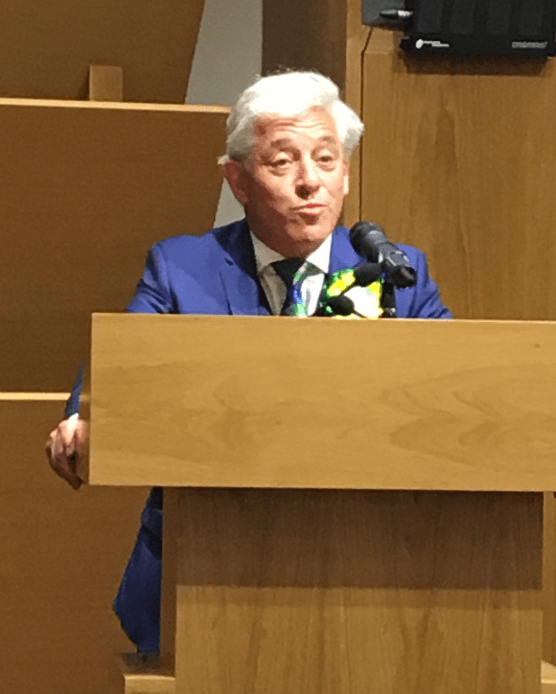 That is why when there’s an election they stand with their “party” as “The Speaker seeking re-election” (see ballot paper). Traditionally no-one stands against them. To reinforce the point, this is a picture of him accepting his re-election last night, wearing a non-Party green and yellow rosette.